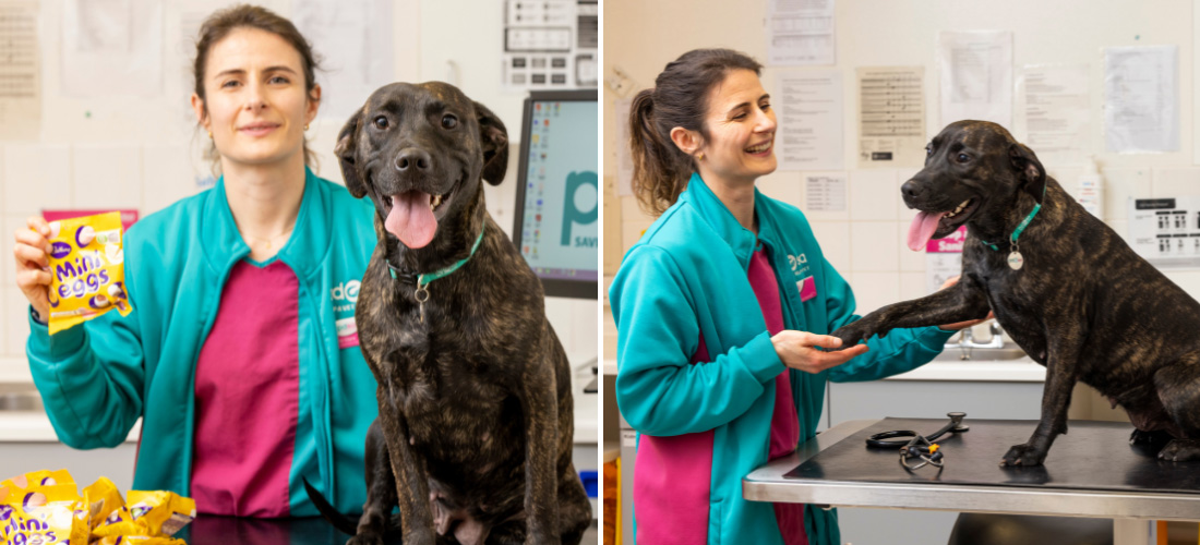 PDSA Vets save sweet-toothed crossbreed, Charlie, after she got her paws on a whopping 1kg of chocolate mini eggs.