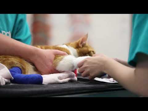 A PDSA Vet said: “When Harry arrived, he couldn’t bear any weight on his injured leg. He had some extremely nasty, deep wounds down to the bone in his lower leg, and the bottom part was very swollen. We admitted him for X-rays under anaesthetic, which revealed he also had a fractured metatarsal bone (one of the long bones in the foot). His wounds were cleaned and dressed to prevent further infection, and he was kept in overnight for pain relief and close monitoring.