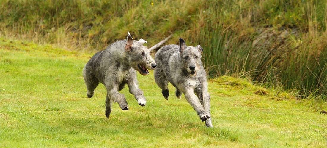 Your Irish Wolfhound will need a minimum of two hours of exercise every day to keep them fit and healthy. It’s better to spread this across the day rather than doing two hours in one go. We’d recommend splitting this into walks and off-lead exercise in a safe area. Make sure that at least one of your walks gives your dog chance to have a good sniff and nose around. On top of this, your Wolfhound will need plenty of playtime and training sessions along with free time in the garden for a bit of variety. Because of their large size and quick growth, you’ll need to take exercise easy while they are a puppy – you can read more on our website.