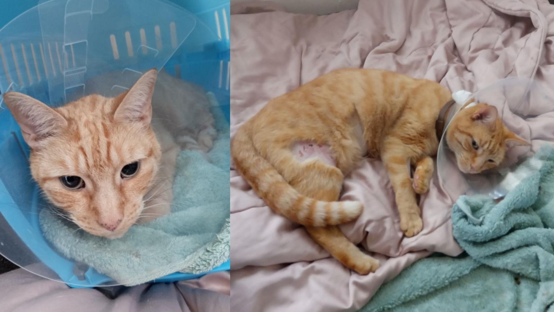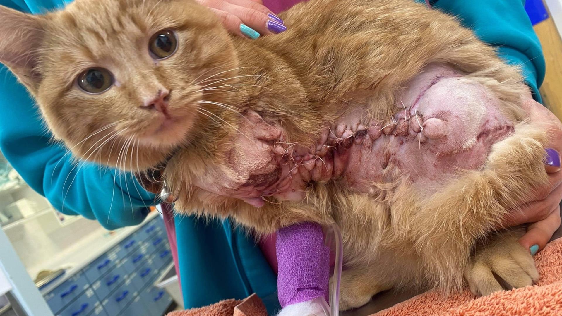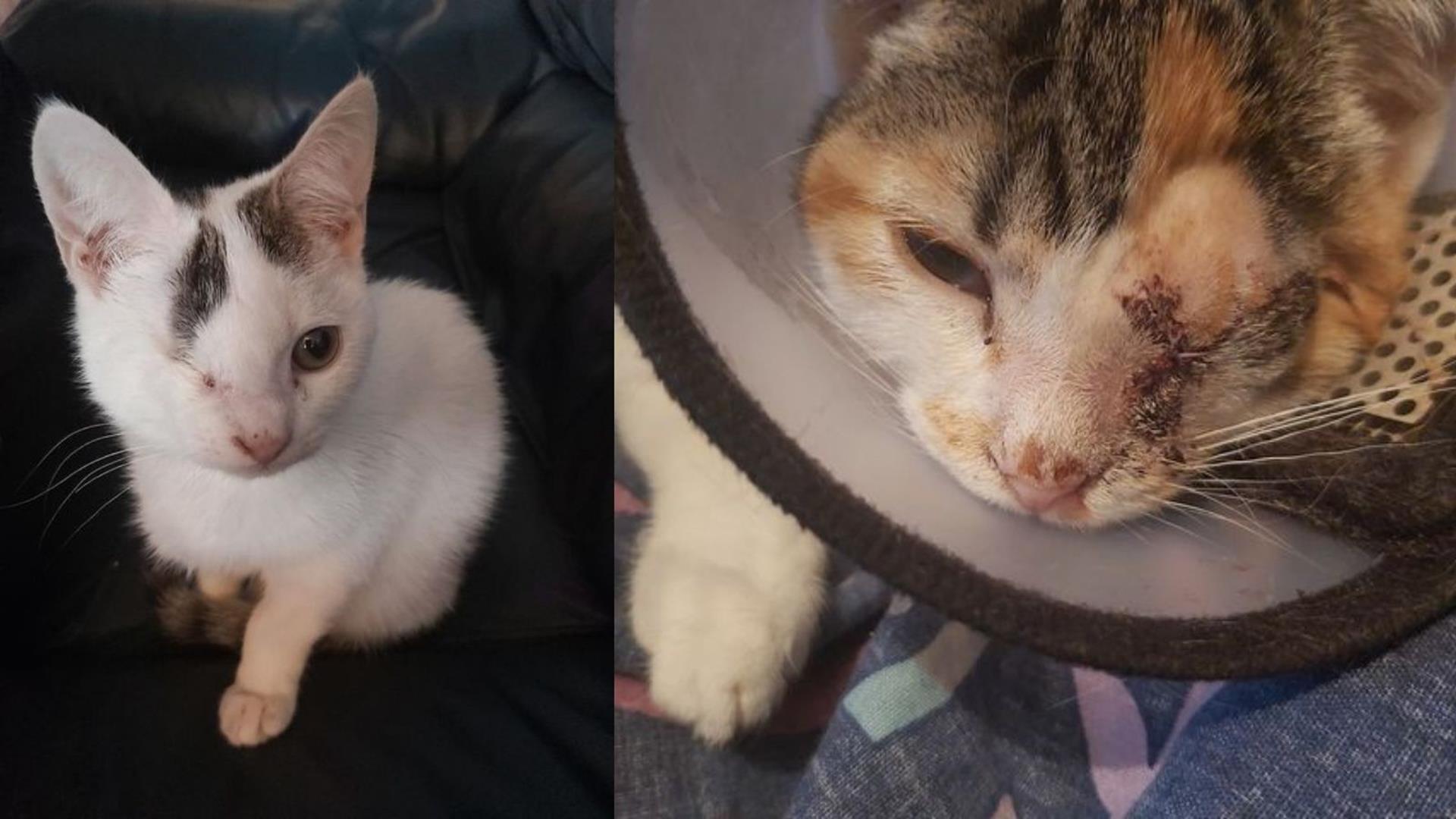 CupCake, a three-year-old cat, was severely injured after she was trapped in a rabbit snare.