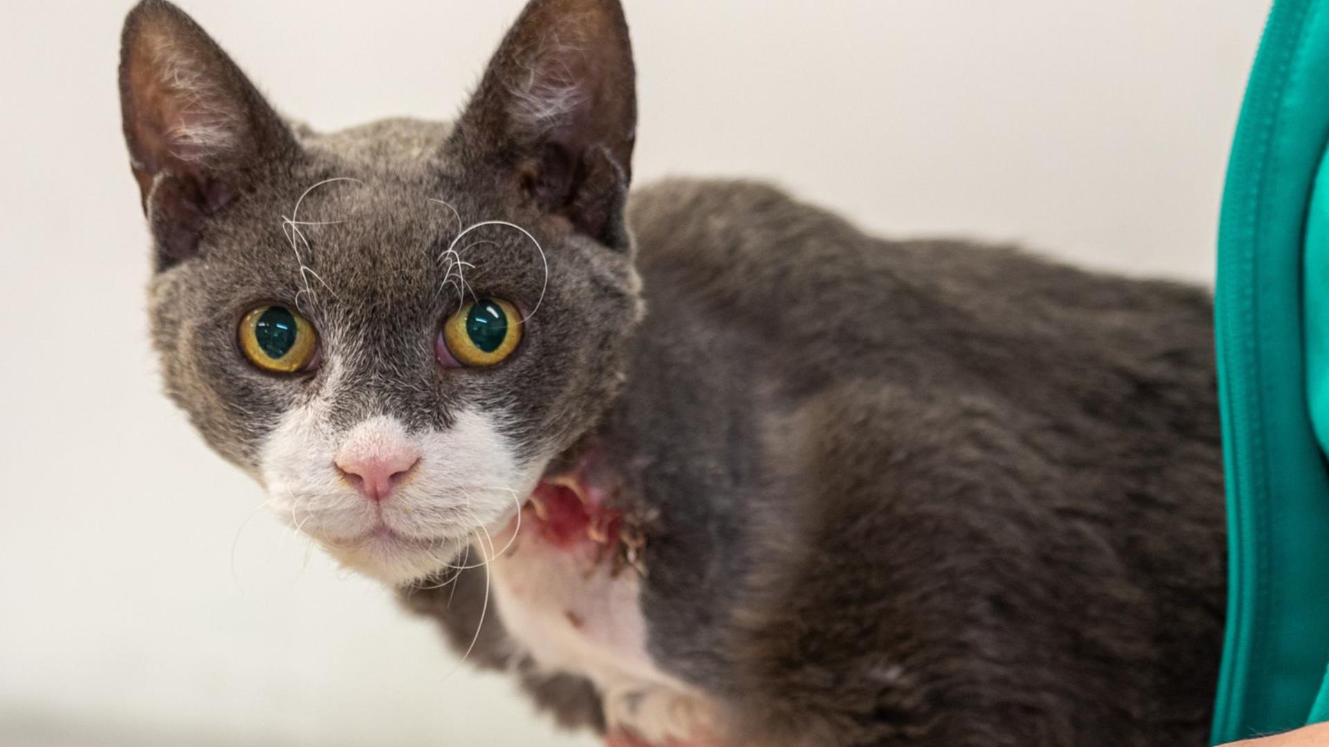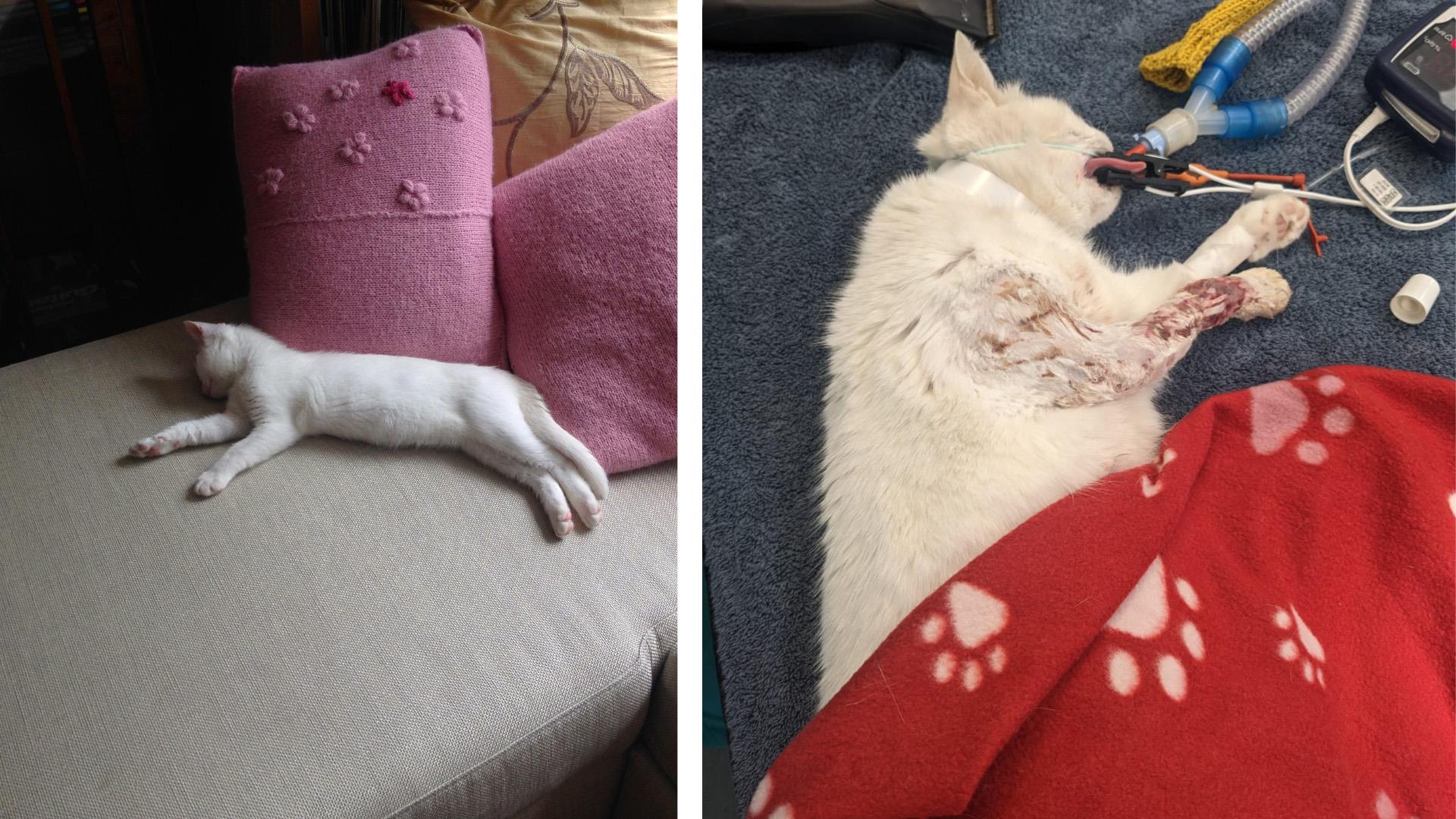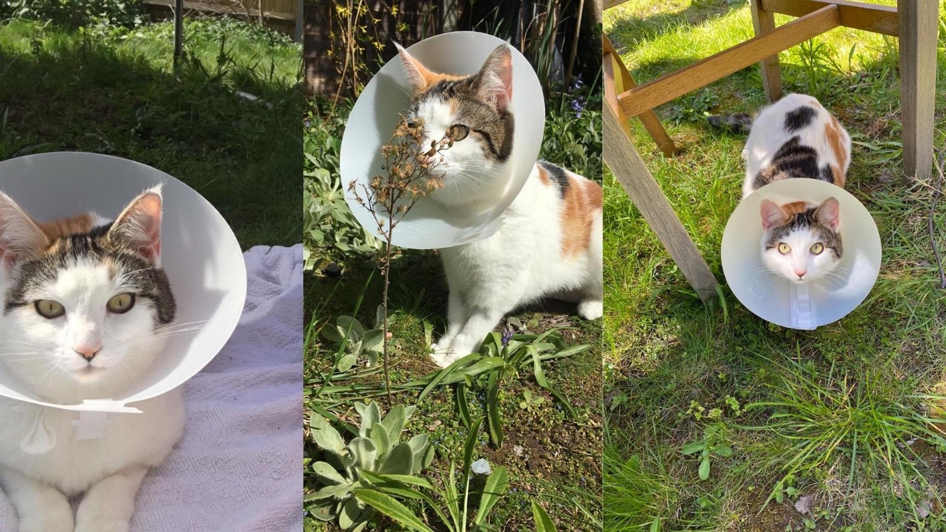 CupCake, a three-year-old cat, was severely injured after she was trapped in a rabbit snare.
