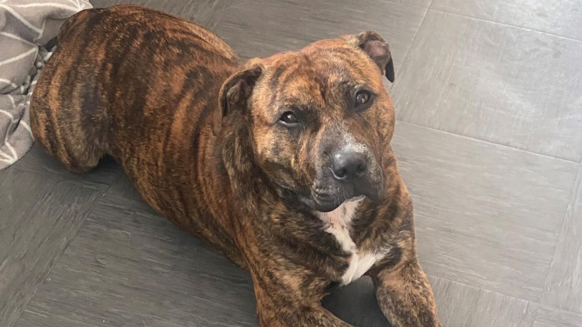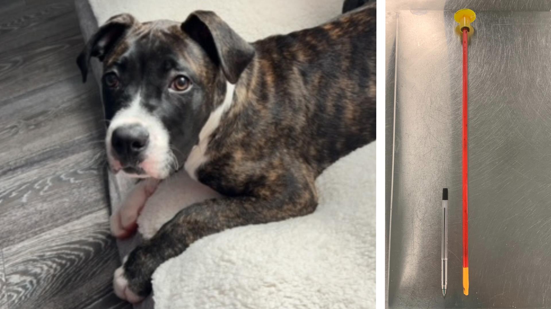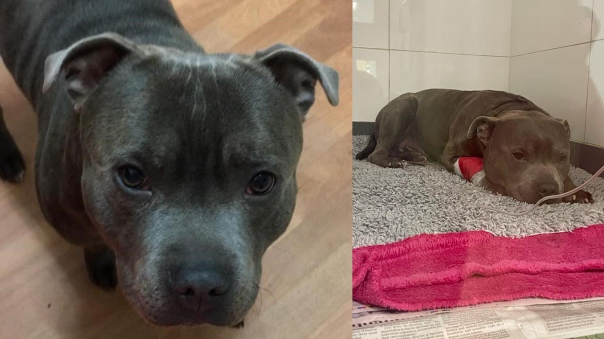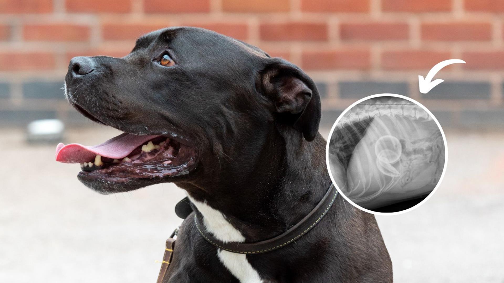 Dudley, a Staffordshire Bull Terrier cross, needed emergency surgery to remove a toy from his intestines after he accidentally swallowed it.