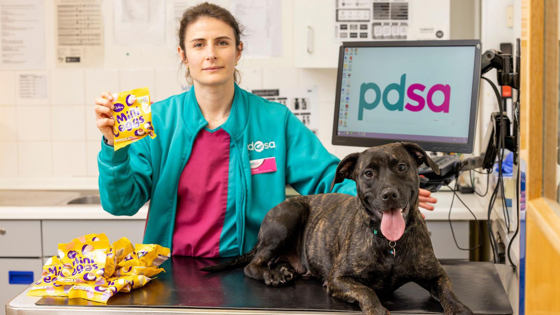 PDSA Vets save sweet-toothed crossbreed, Charlie, after she got her paws on a whopping 1kg of chocolate mini eggs.
