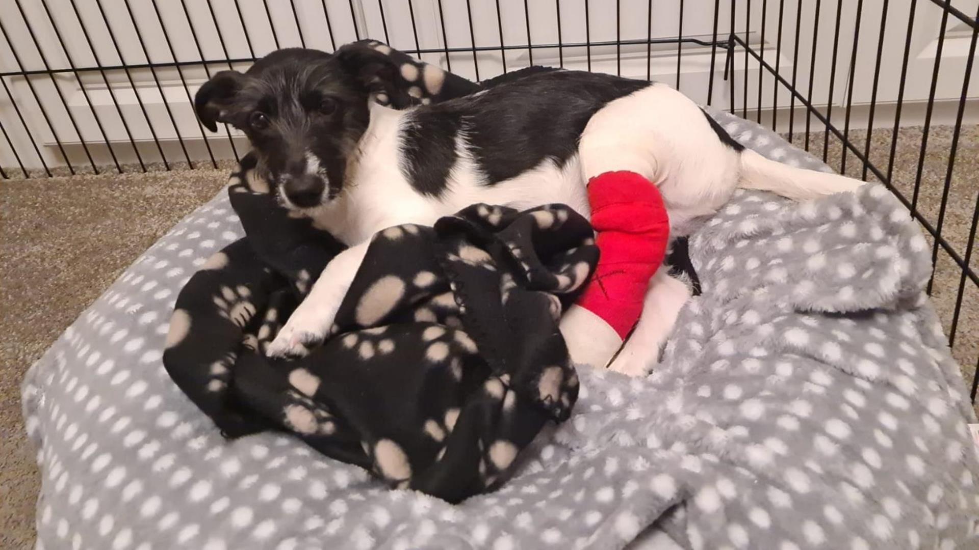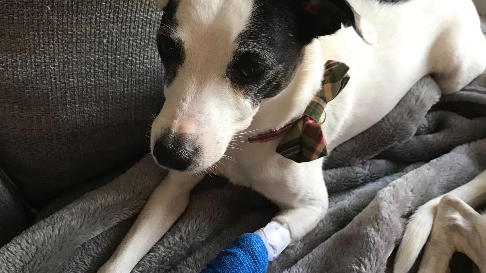 Five-month-old Jack Russell terrier, Cooper, fell off the bed and suffered a break to his back left leg.