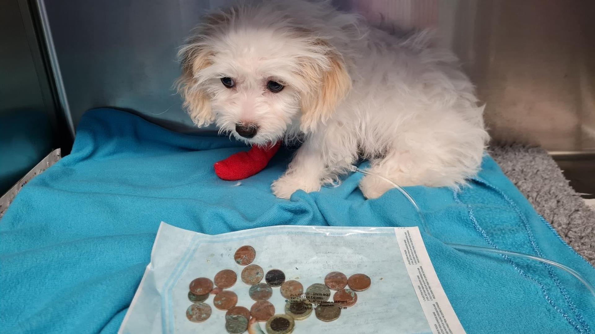 12-week old Bichon Frise cross puppy, Daisy, needed emergency surgery after swallowing twenty coins.