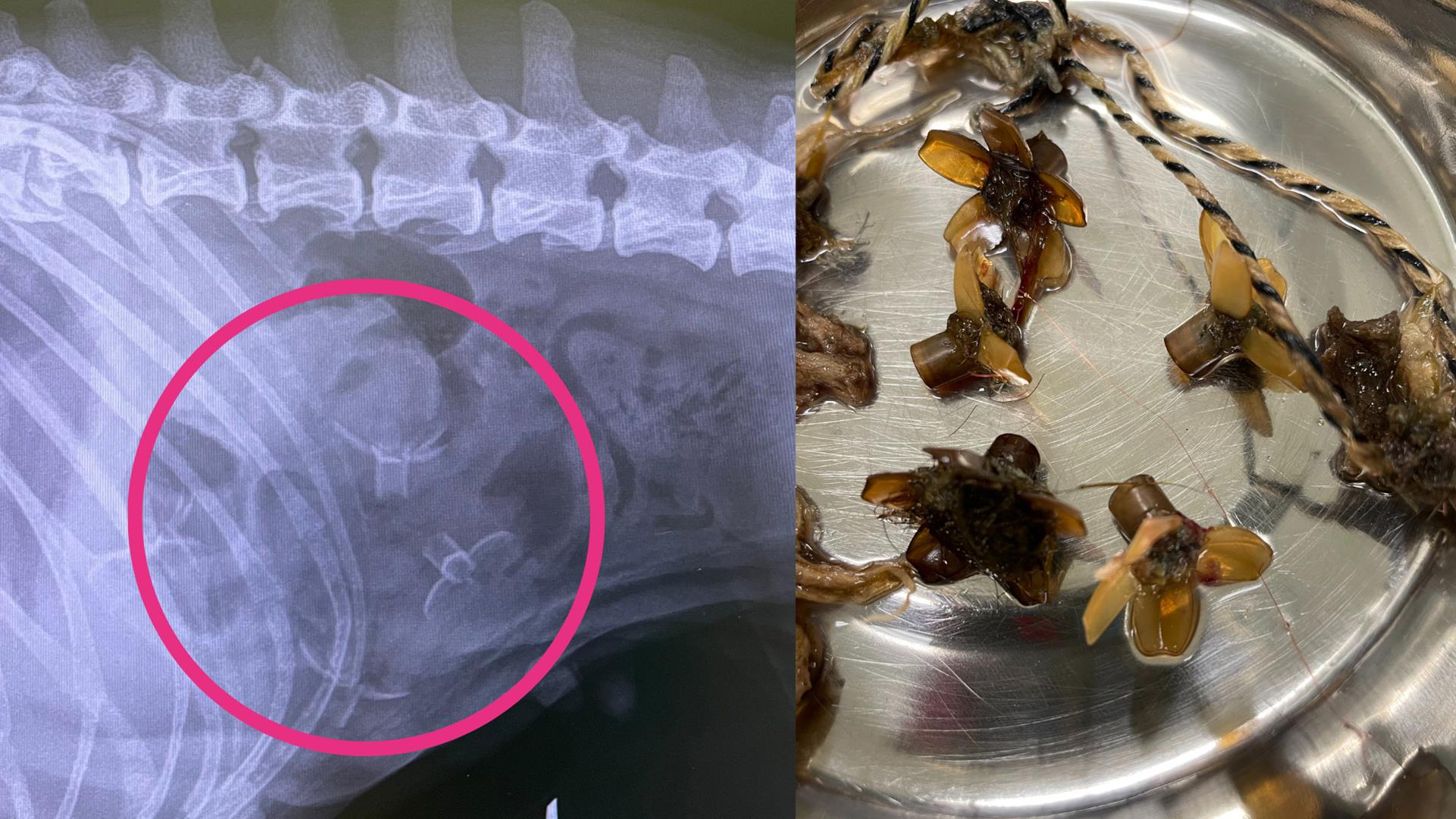Titch, a four-month-old Staffordshire Bull-Terrier began chewing on the sparkly ornament, swallowing pieces of plastic as well as bits of tinsel.