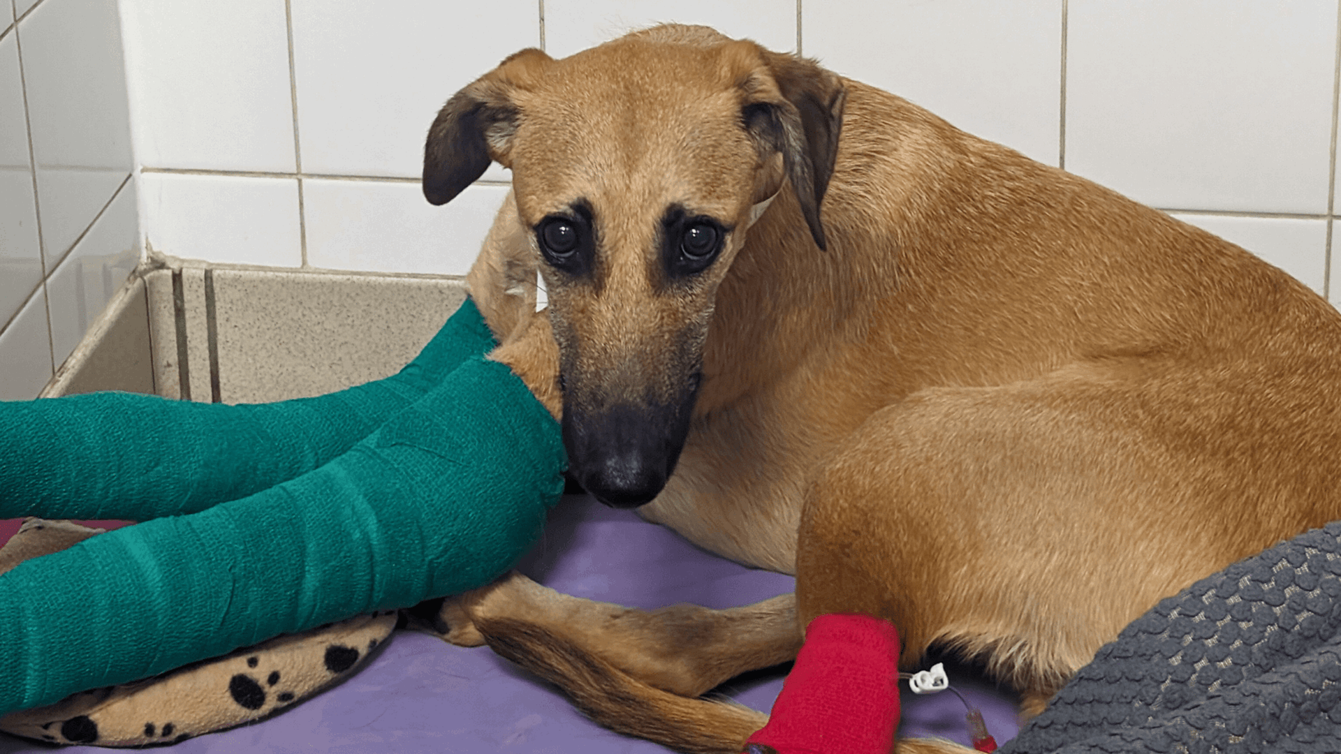 PDSA vets saved Munchie, a two-year-old Whippet, after he tried to jump over a 7ft fence and broke both his front legs.