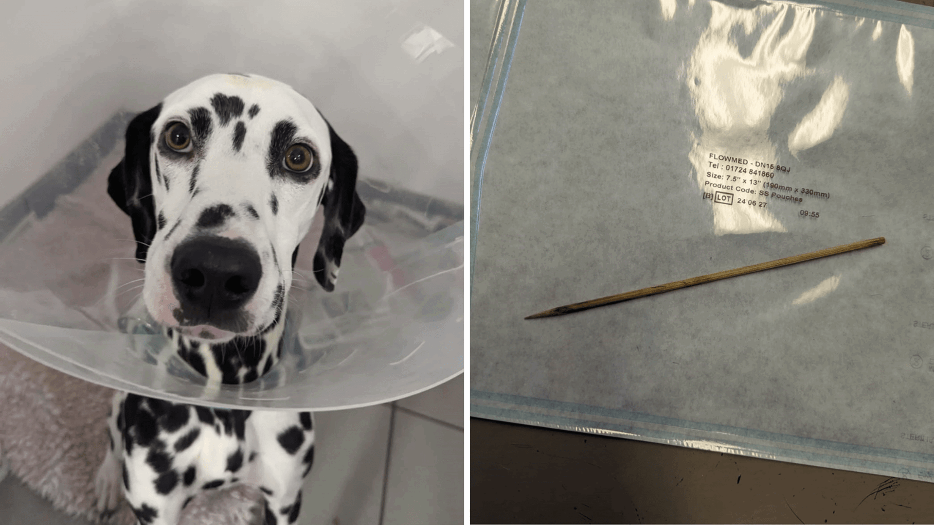 Three-year-old Dalmatian, Shenzi, narrowly escaped death after swallowing a six-inch bamboo kebab skewer she discovered in a bin.